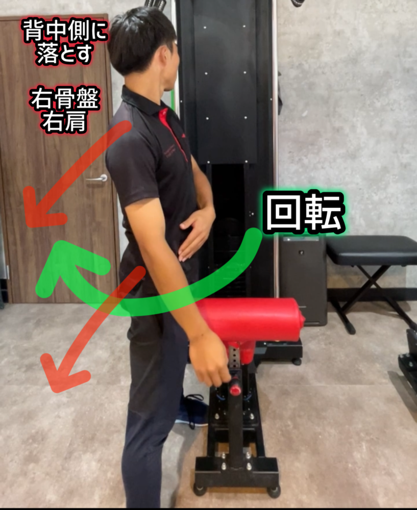 それとほぼ同時に右の骨盤と右肩を背中側に